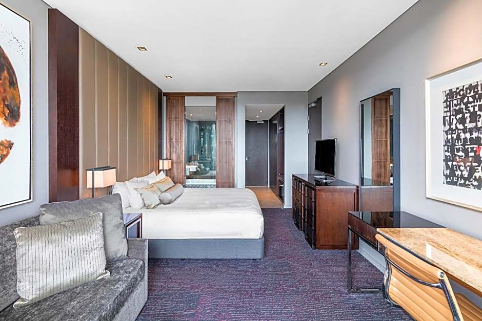 The Paddington Room offers additional living space and a large private balcony, with full glass sliding doors that fill the room with natural light and showcase views across Petrie Terrace. Guests can enjoy a 65-inch smart TV, state-of-the-art audio-visual entertainment system, and a Sealy Dynasty Series bed with a luxury feather and down bed topper.